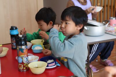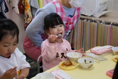 園では、日々の給食や野菜栽培、調理体験、食に関する行事などを通して、こどもたちの食に対する前向きな気持ちを育んでいきます。